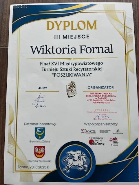 W dniu 28 października 2025 r. odbył się w Żabnie finał XVI Międzypowiatowego Turnieju Sztuki Recytatorskiej „Poszukiwania”, w którym powiat tarnowski reprezentowała uczennica naszej szkoły Wiktoria Fornal. Na tym etapie Komisja Konkursowa również wysoko oceniła jej recytację, przyznając III miejsce.
