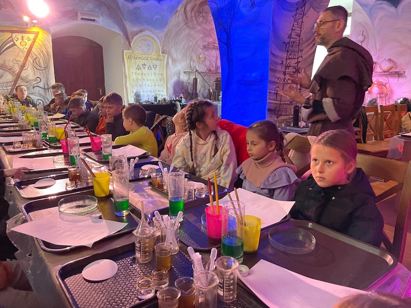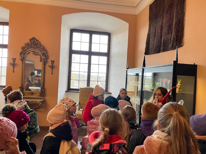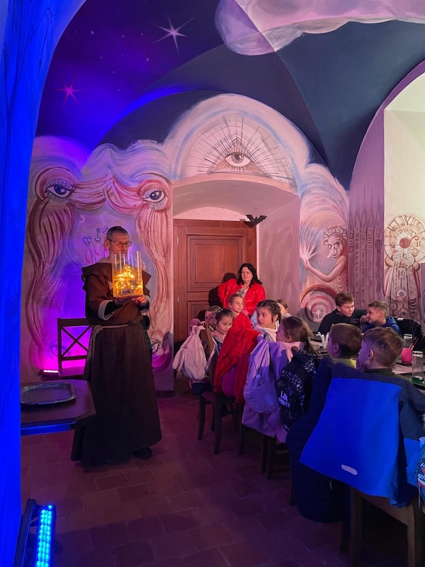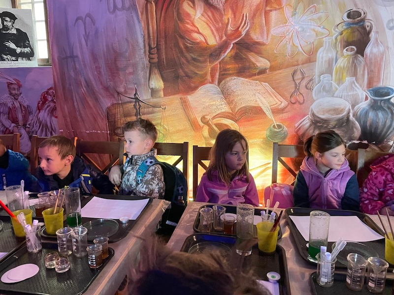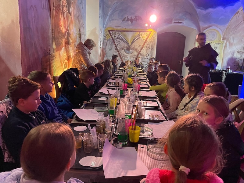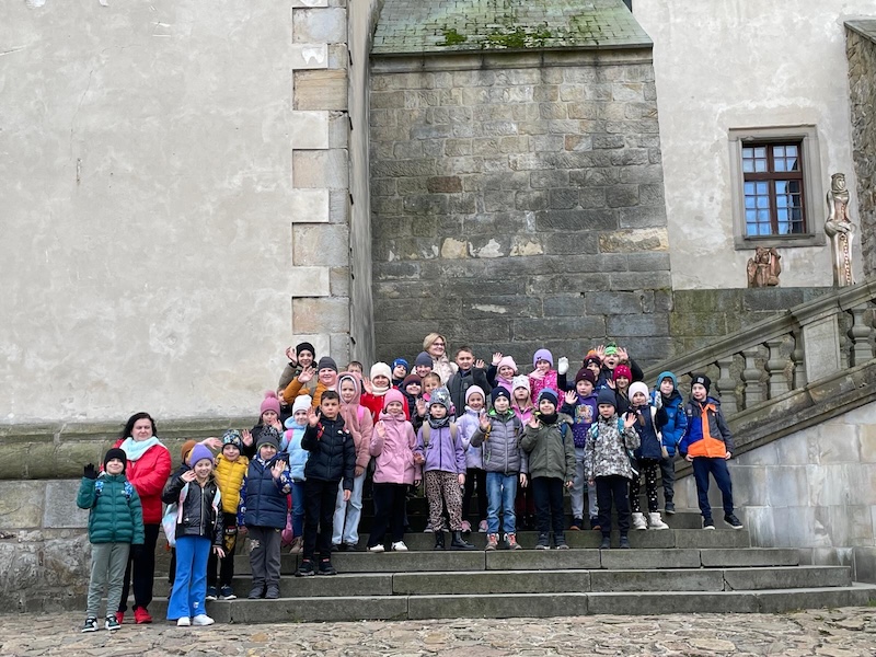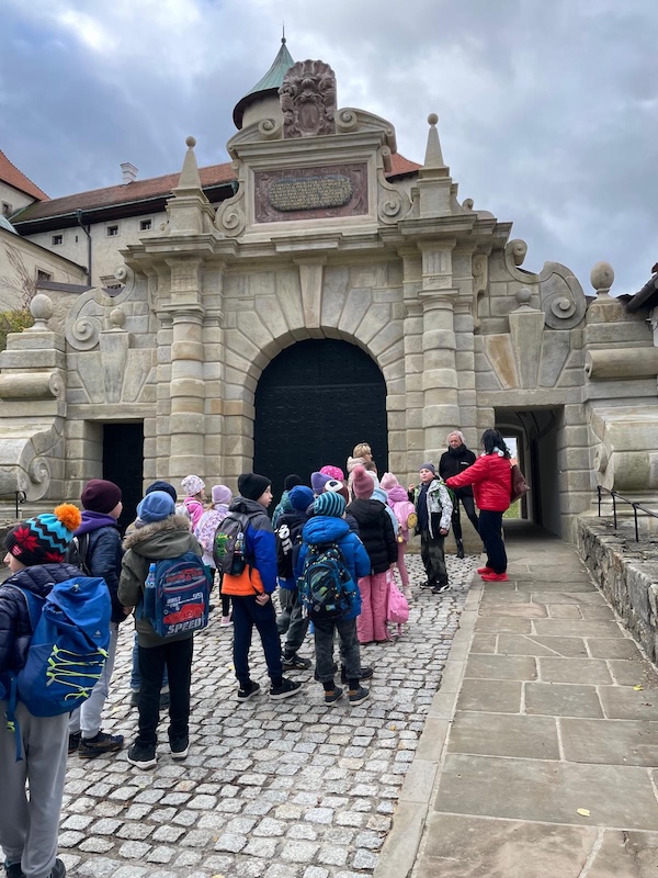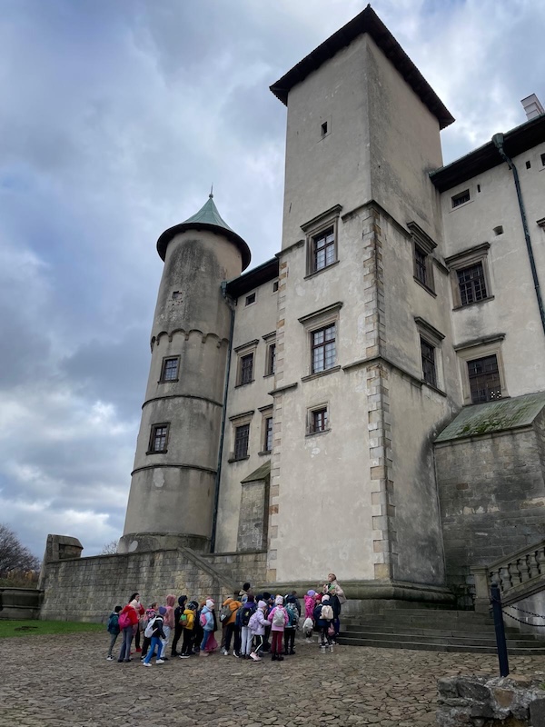 Dzisiaj dzieci z klas 1-3 wyruszyły do Nowego Wiśnicza, gdzie miały okazję poznać historię zamku, brały udział w "Poszukiwaniu zaginionego skarbu Barbary”, a w pracowni alchemika mogły spróbować swoich sił w dawnych eksperymentach. Pobyt w zamku rozpoczęliśmy w tajemniczej scenerii pracowni alchemika, gdzie zostaliśmy przeniesieni do czasów, w których alchemia była sztuką niezwykłą. Warsztaty składały się z historycznej pogadanki połączonej z pokazem alchemicznego sprzętu i doświadczeń. Scenariusz warsztatów został tak opracowany, by dzieci zdobyły nie tylko wiedzę historyczną, ale również ćwiczyły umiejętności praktyczne. Następnie wzięliśmy udział w „Poszukiwaniu zaginionego skarbu Barbary”, w trakcie której poznaliśmy zamek, legendy wiśnickie oraz słowiańskie baśnie, trenowaliśmy spostrzegawczość, umiejętność logicznego myślenia i pracę w grupie. Każde z dzieci, za pomoc w znalezieniu skarbu otrzymało od Barbary amulet na szczęście. Na koniec pobytu odwiedziliśmy „Bastion VR”. Dzięki nowoczesnej technologii okularów VR każde dziecko mogło zobaczyć zamek z zupełnie innej perspektywy – oczami nietoperza, który jest symbolem zamku w Nowym Wiśniczu.