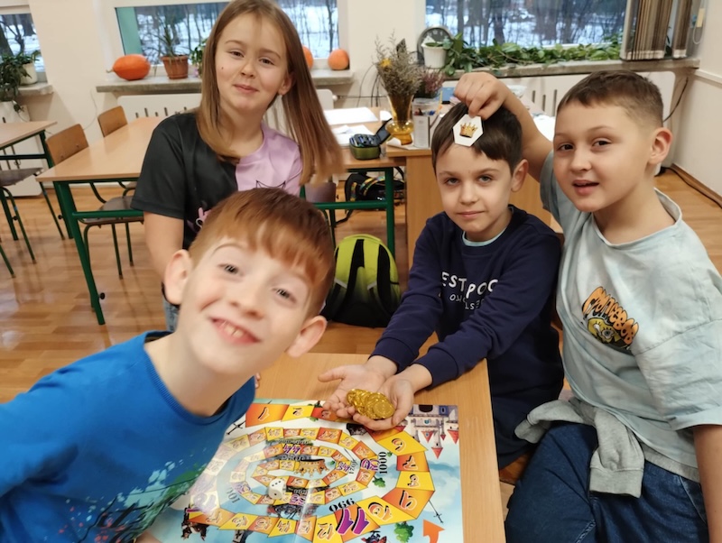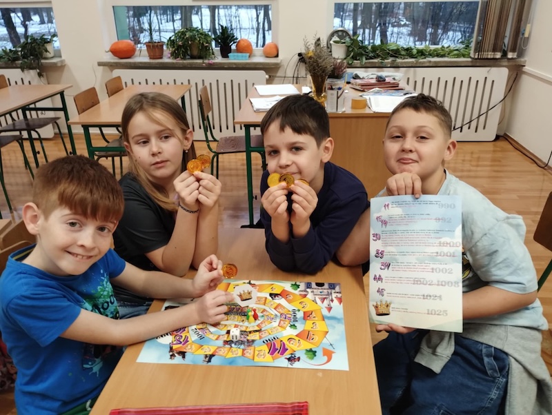 W dniu 26 listopada 2025 r. uczniowie z klasy II podczas zajęć logopedycznych i korekcyjno-kompensacyjnych grali w ciekawą grę pt. Jak Bolesław Chrobry zdobył koronę?. Została ona wydana przez Oddział Małopolski Polskiego Związku Logopedów. Uczniowie nie tylko doskonalili artykulację głosek, ćwiczyli percepcję słuchową i wzrokową, ale też poznawali historię związaną z pierwszym królem naszego państwa.