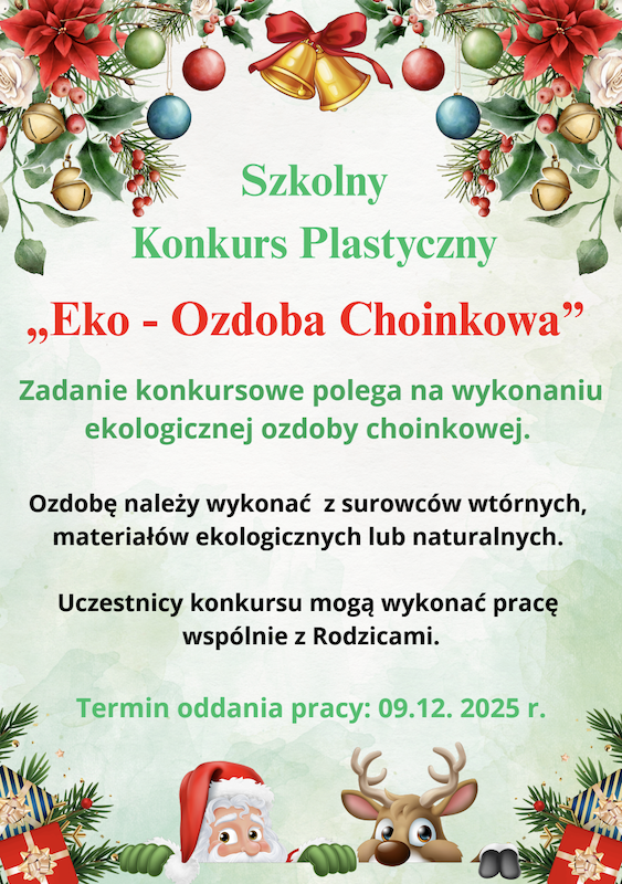 Zobacz również 05.12.2025 Szkolny Konkurs Piosenki Świątecznej 04.12.2025 Igrzyska Dzieci i Igrzysk Młodzieży Szkolnej w... 04.12.2025 Konkurs Animacji Komputerowej dla uczniów klas IV... Szkolny Konkurs Plastyczny Opublikowano: 05 grudnia 2025 10:08 Kategoria: Aktualności Wydrukuj Wyświetleń: 6