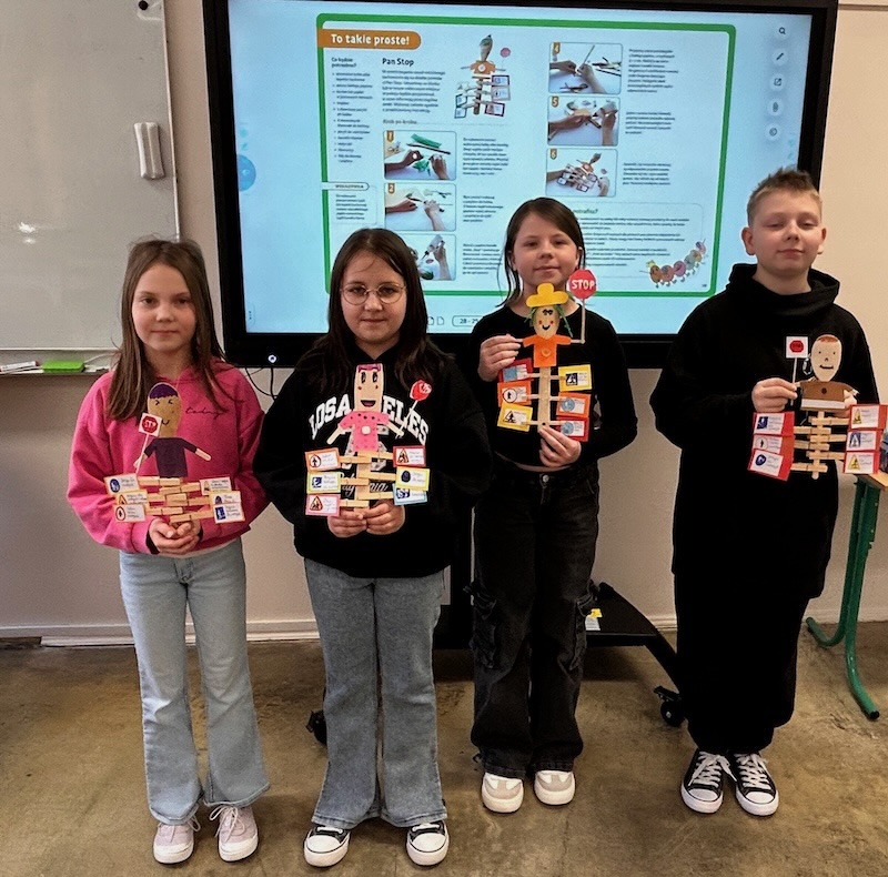 Czwartoklasiści na lekcji Techniki: „Pan STOP” uczy, jak bezpiecznie przejść przez ulicę!